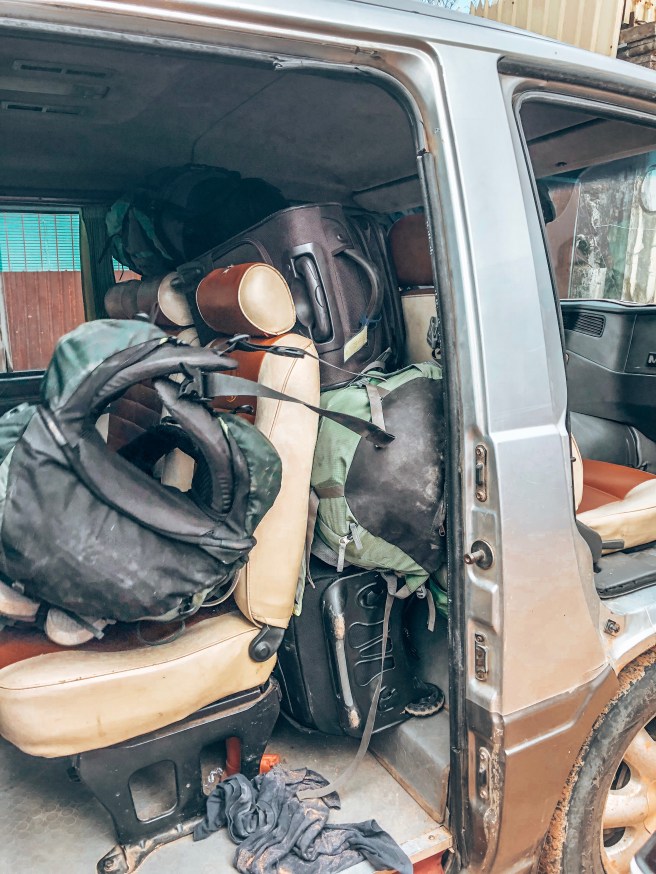 Pünktlich um 11:30 Uhr kam der Minivan, in den 16! Leute inkl. Gepäck gequetscht wurden, obwohl gerade mal 15 Plätze vorhanden waren. Das Gepäck wurde einfach in irgendwelche nicht vorhandenen Hohlräume gequetscht, sodass einem quasi drei Stunden lang die Knie am Ohr hingen. Bewegung war somit also nicht mehr möglich. Toll war dazu noch, dass die Straßen keine Straßen waren also schon aber ausgestattet mit einem Schlagloch nach dem anderen.