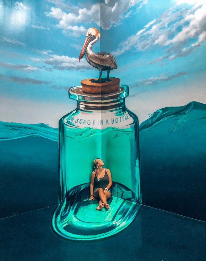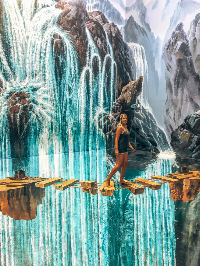 Am Eingang mussten die Schuhe abgegeben werden, nagut. Und dann ging es von Raum zu Raum, jeder hatte spezielle Malereien und Punkte auf dem Boden markiert, um das ideale Bild mit 3D-Faktor zu erzielen. Eine lustige und interessante Erfahrung, die hier nicht fehlen darf.