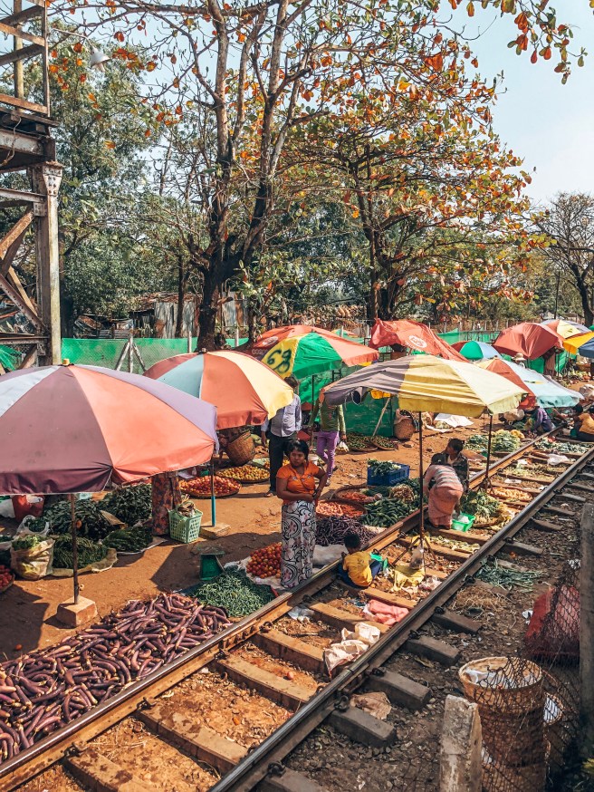 Nach einer Stunde Fahrt hieß es dann plötzlich aussteigen. Ein Blick aus dem Fenster verriet, dass wir da sind und neben dem Zug bereits das reinste Treiben war. Aus dem Zug gesprungen und schon waren wir mitten drin zwischen Zwiebeln und Obst. Der Zug fuhr weiter, über die Zwiebeln die ihren Liegeplatz zwischen den Gleisen gefunden hatten und vorbei an dem Geschehen. Kaum war der Zug weg wurden schon die Sonnenschirme wieder aufgespannt, als wäre nichts gewesen.