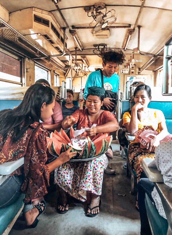 Die Fahrt mit der klapprigen Eisenbahn startet am Hauptbahnhof „Central Railway Station“ in Yangon. Nachdem das Ticket gekauft ist kann man sich auch schon einen freien Platz in einem beliebigen Abteil suchen. Als Tourist ist man auch hier glücklicherweise in der Unterzahl und trifft nur vereinzelt gleichgesinnte. Somit ist man also völlig unter sich mit den Einheimischen und auch hier wird man angestarrt aber nicht auf penetrante Weise, sondern auch hier wieder neugierig und interessiert. Der Zug fährt gefühlt mit 10 km/h, es wird mit offenen Fenstern gefahren, denn eine Klimaanlage existiert nicht und selbst die vorhandenen Ventilatoren haben ihre beste Zeit hinter sich und dienen nur als Dekoration an der Decke, somit war schwitzen also vorprogrammiert. Beim Halt und auch während der Fahrt laufen zig Verkaufsleute durch die Gänge, sei es mit frischem Obst, Mittagessen oder Getränken. Wer Hunger hat bekommt für kleines Geld sein Essen auf einem Plastikhocker mitten im Gang gezaubert und wen wundert es, es schmeckt.