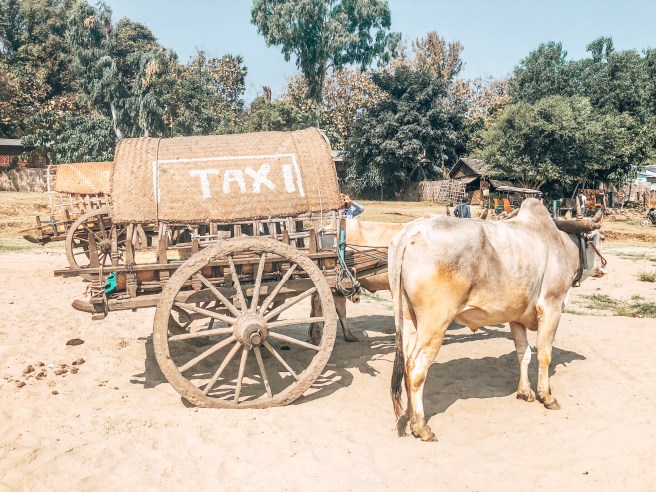 Kaum in Mingun angelegt wurde uns auch schon wild von den Taxifahrern zugewunken. Lustigerweise gab es hier keine Taxis auf vier Rädern, sondern auf vier Hufen, nämlich Kühen. Was uns völlig unreal und tierquälend vorkommt ist hier noch völlig normal aber für den kurzen Weg schlagen wir das Angebot dankend aus.